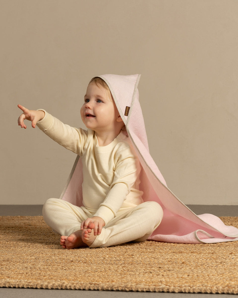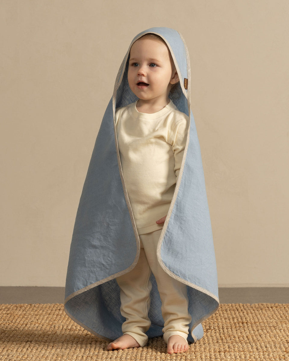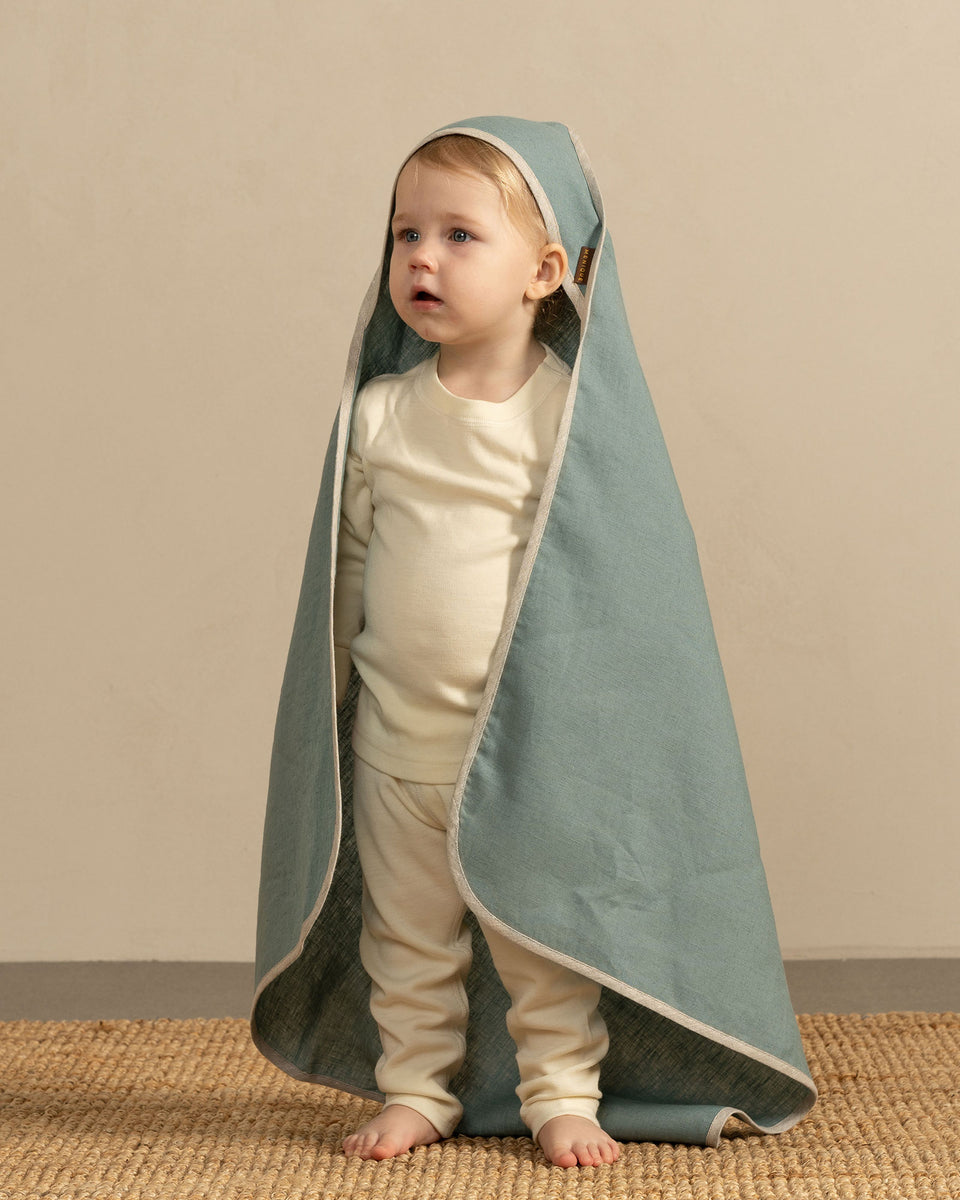 Ein Kapuzen-Badetuch für Babys, gefertigt aus hochwertigem, 100 % Bio-Leinenstoff. Seine hervorragende Saugfähigkeit trocknet Ihr Baby nach dem Baden schnell und hüllt sanft Kopf und Körper ein, für ein kuscheliges, wohliges Gefühl. Das Leinen-Kleinkindtuch kann auch als Pucktuch oder als Abdeckung für die Wickelunterlage verwendet werden.