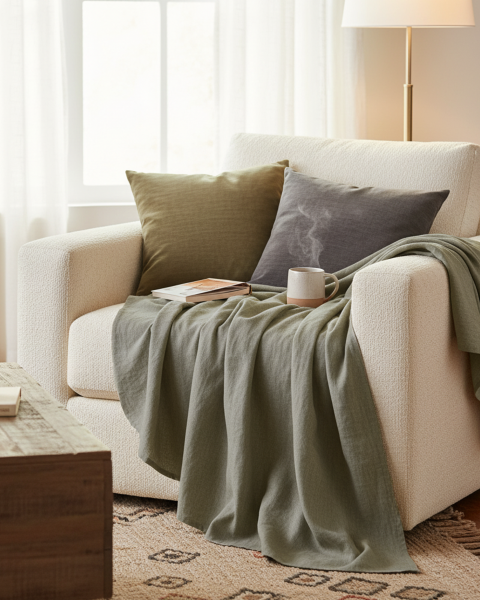 Verbessern Sie Ihren Wohnkomfort mit unserer Leinen-Wohndecke. Hergestellt aus 100 % Bio-Leinen, ist unsere Decke Ihre ideale Lösung für ganzjährigen Komfort. Ob an einem kühlen Winterabend oder einer lauen Sommernacht – unsere atmungsaktive Leinen-Wohndecke hält Sie warm. Die natürliche Atmungsaktivität von Leinen sorgt dafür, dass Sie sich wohlfühlen, ohne zu heiß oder zu kalt zu sein. Ihre weiche, luxuriöse Textur ist sanft zur Haut und perfekt, um sich mit einer Tasse Tee einzukuscheln, eine zusätzliche Schicht auf dem Bett hinzuzufügen oder das Sofa optisch aufzuwerten.