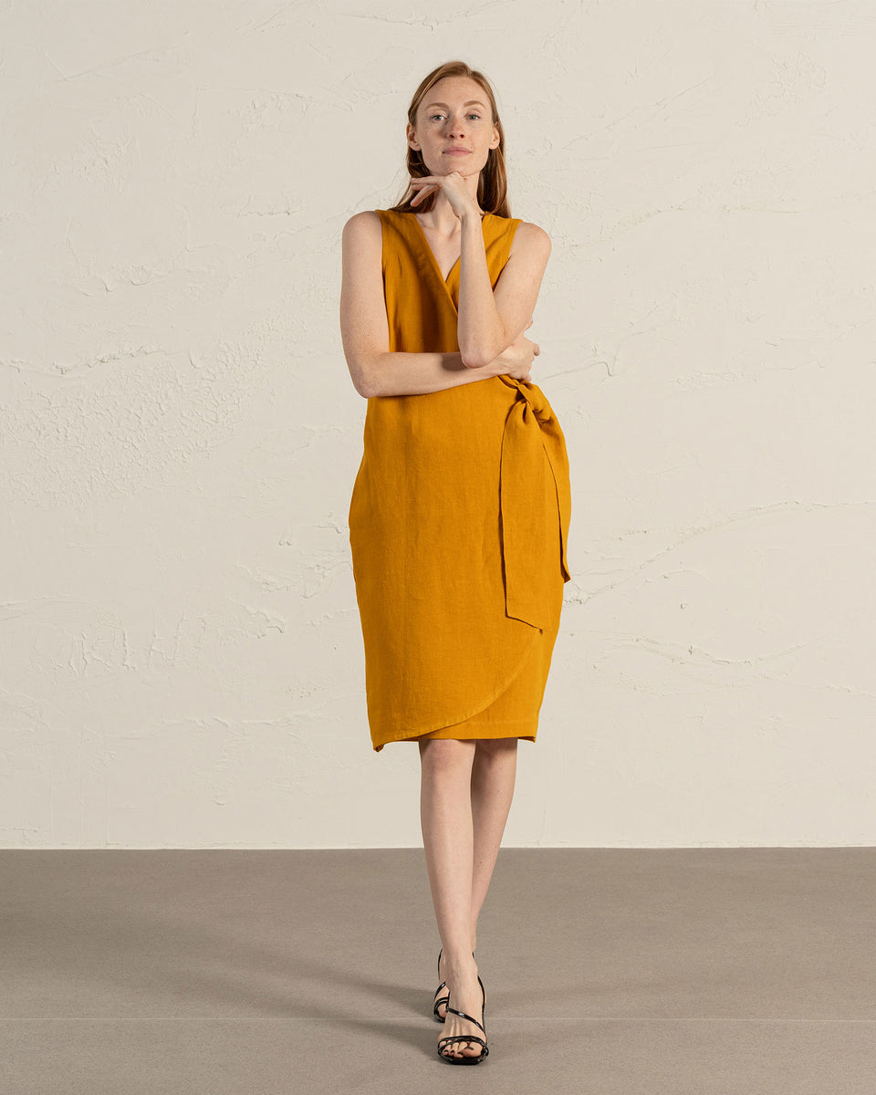Bio-Leinen Wickelkleid, gefertigt für Komfort aus 100 % Leinen. Das midilange Kleid besticht durch markante Seitenschleifen, einen dezenten Knopfverschluss und praktische Seitentaschen. Mit einem atemberaubenden V-Ausschnitt umrahmt dieses Kleid elegant Ihren Dekolletébereich.