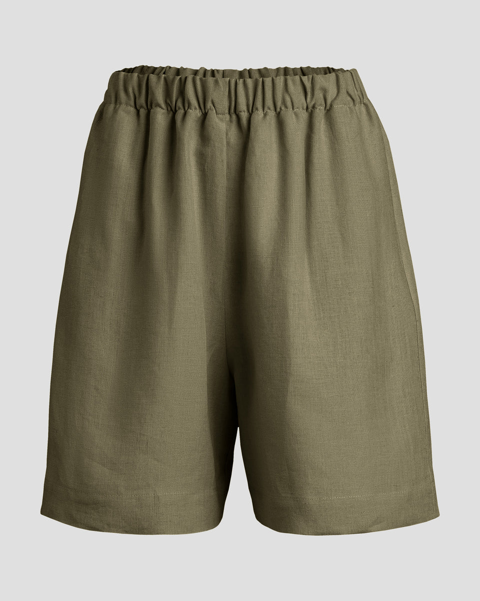 Halte dein Outfit modern mit diesen 100 % Leinen-Longshorts, deren atmungsaktives Material hautfreundlich ist und ein kühles Tragegefühl bietet. Mit einem breiten elastischen Bund entworfen, passen sich diese hochgeschnittenen Shorts nahtlos deinem Körper an und bieten unvergleichlichen Komfort, sodass du dich schwerelos und unbeschwert fühlst. Trage diese Bermuda-Shorts an heißen Sommertagen oder zu semi-formellen Anlässen und beeindrucke alle mit einem stilvollen und soliden Look, oder wähle unser kürzeres Pull-on-Shorts-Modell für aktive Sonnentage.