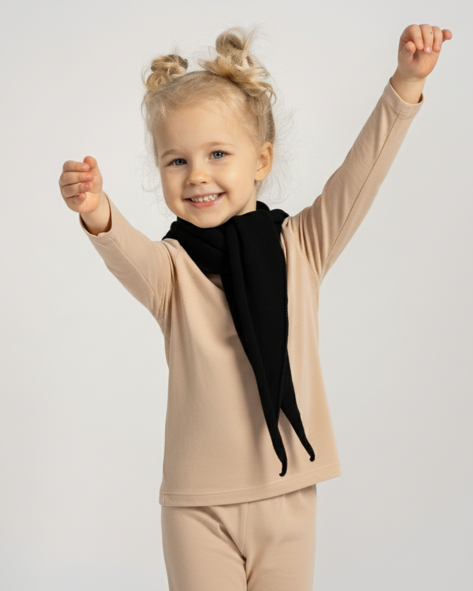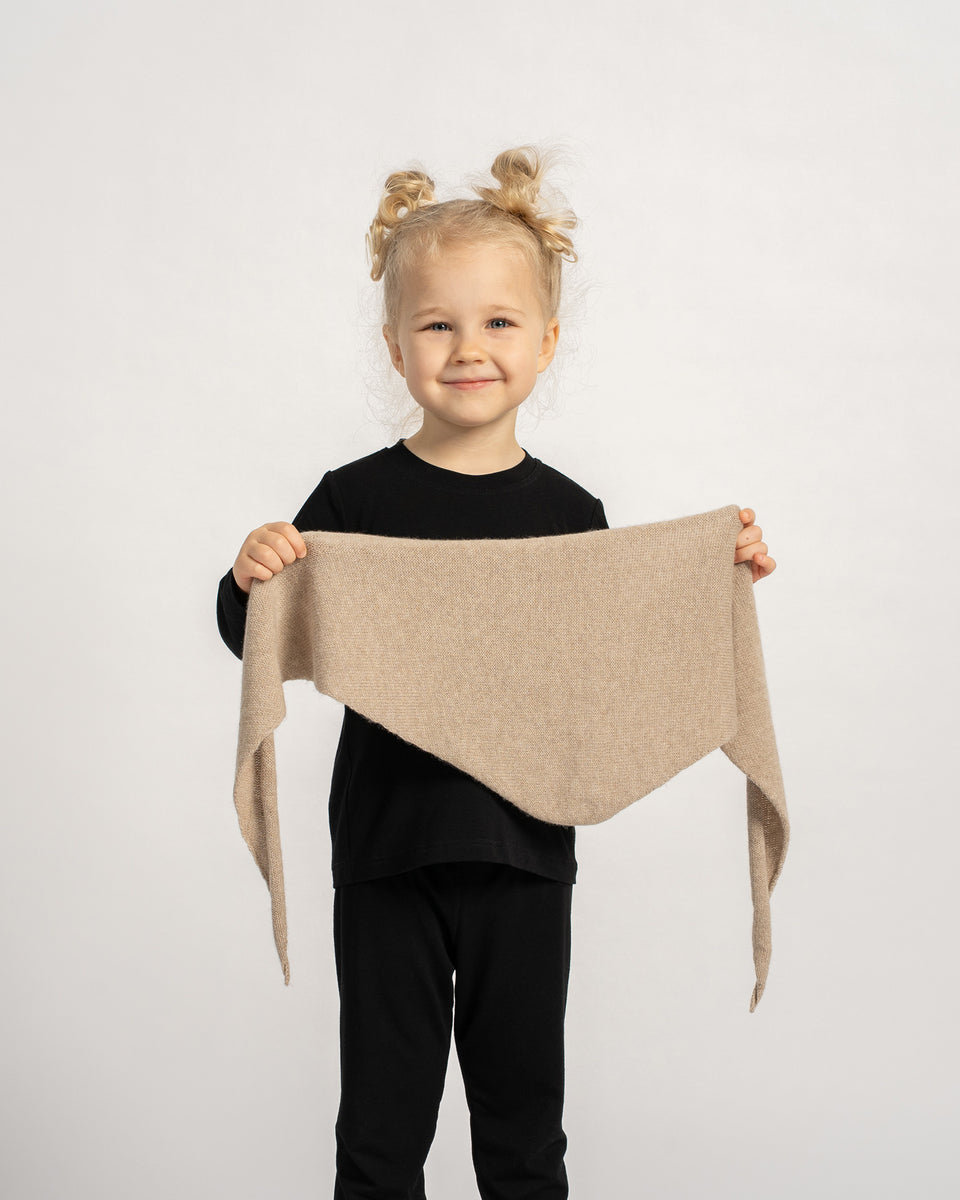 Hergestellt aus einer weichen Mischung aus 30 % Kaschmir und 70 % Merinowolle, bietet dieses Kinder-Kaschmir-Strickbandana die perfekte Kombination aus Luxus und Funktionalität. Merinofasern regulieren dank ihrer feinen, atmungsaktiven Struktur auf natürliche Weise die Temperatur und leiten Feuchtigkeit ab, sodass die Haut auch bei aktivem Spielen trocken bleibt. Kleiner als ein traditioneller Schal, verleiht dieses elegante Dreieckstuch jedem Outfit eine raffinierte Note, ohne klobig oder schwer zu wirken. Der praktische Binderverschluss hält das gestrickte Dreieckstuch sicher an seinem Platz und zerzaust nicht die Haare, wodurch das Kinderbandana perfekt für Spielzeit, Schule oder Outdoor-Abenteuer ist. Ob als Kopftuch, Halsaccessoire oder dreieckiges Bandana getragen, ist dieses Kaschmir-Strickstück ein stilvolles Detail, das alltäglichen Charme mit der cleveren Funktionalität von natürlicher Wolle verbindet.