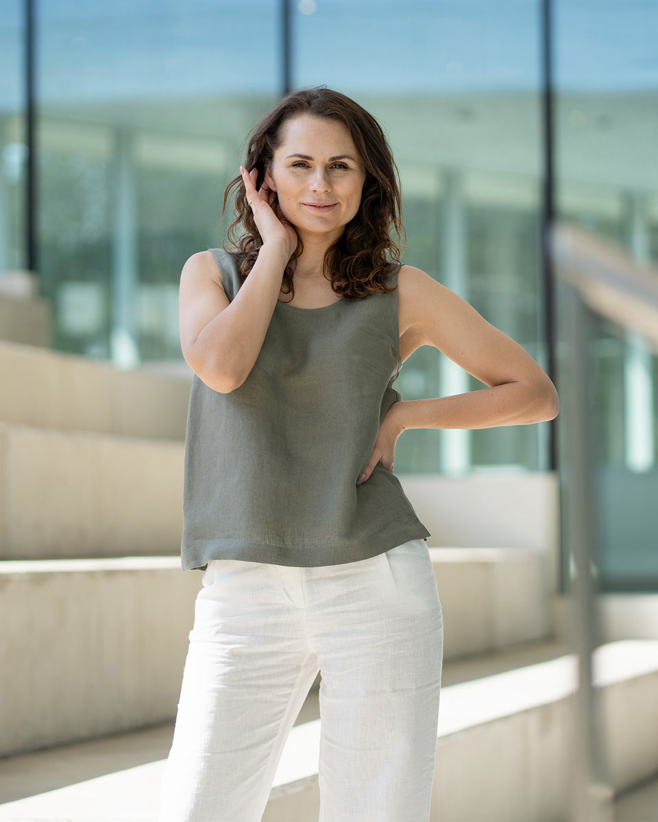 Das Hana Tanktop ist eine luftige Sommerbluse aus hypoallergenem und biologischem 100 % Leinenstoff, der für seine außergewöhnliche Atmungsaktivität, Feuchtigkeitsregulierung und Hautverträglichkeit, selbst bei empfindlichster Haut, bekannt ist. Das Leinen-Tanktop verfügt über einen Rundhalsausschnitt, eine lockere Silhouette und einen geraden Schnitt. Mit kleinen Schlitzen an beiden Seiten ist das Leinen-Top der perfekte Begleiter zu unserer hochgeschnittenen Leinenhose Dakota oder dem Rock Sophia.