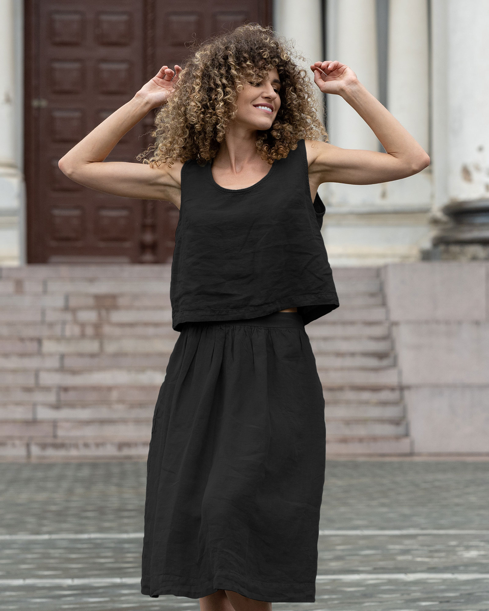 Unser Leinenrock wird nachhaltig aus 100 % Leinenstoff gefertigt und ist damit die perfekte Wahl für wärmere Tage. Die hohe Atmungsaktivität des Leinenstoffs hält Sie kühl, frisch und trocken, während die sanfte A-Linien-Form, der breite Bund und zwei versteckte Taschen ultimativen Komfort für Ihre Sommertage bieten.